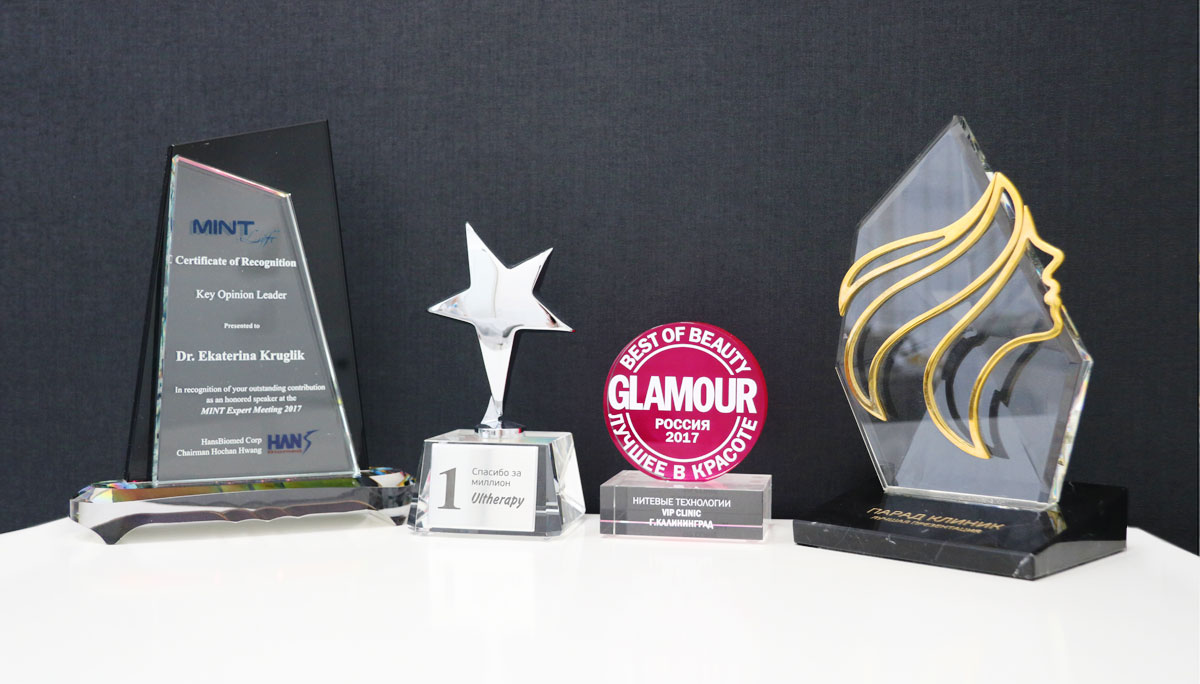VIP Clinic se za poslední rok a půl stala laureátem celoruské soutěže Parade of Clinics (jediná klinika z Kaliningradu, která soutěž vyhrála), vítězem mezinárodního ocenění Glamour Best of Beauty a titulem přední specialista v oboru omlazování nití na mezinárodním kongresu 1ST MINT WORLDWIDE EXPERT MEETING».